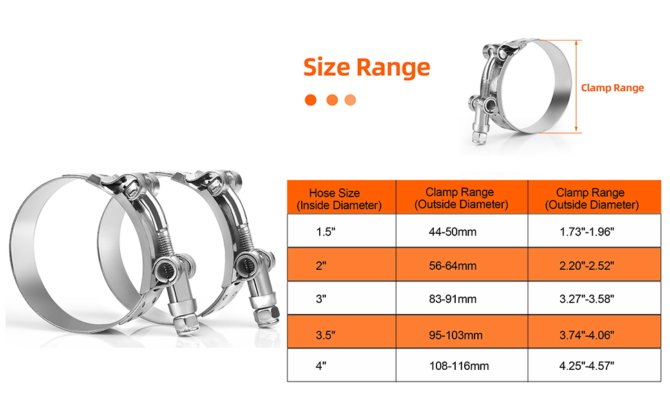 T Bolt Hose Clamp . Stainless Steel material does ensure the outstanding performance in Anti-rust and Anti-corrosion 2 inch T-Bolt Hose Clamp Working Range: Diameter 1.81" - 2.05" same as 46mm - 52mm for 2 inch Hose. 0.625″ Band Width | 0.25″ Plated T-Bolt and Nut | 300-Series Stainless Steel Latch & Bracket | Diameter Range 2.19″ - 6.25″
